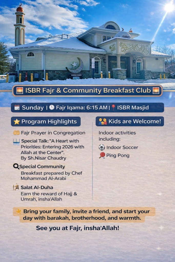 ISBR Fajr & Community Breakfast Club 🗓️Day: Every Sunday🕰️Fajr Iqama: 6:15 AM📍Location: ISBR Masjid🍳🥐🍩Community breakfast will be served after the Fajr prayer.