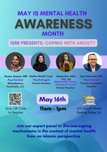 Islamic Society of Basking Ridge (ISBR) is honored to present a special Mental Health Awareness Month program focused on understanding and coping with anxiety through both clinical expertise and Islamic guidance.